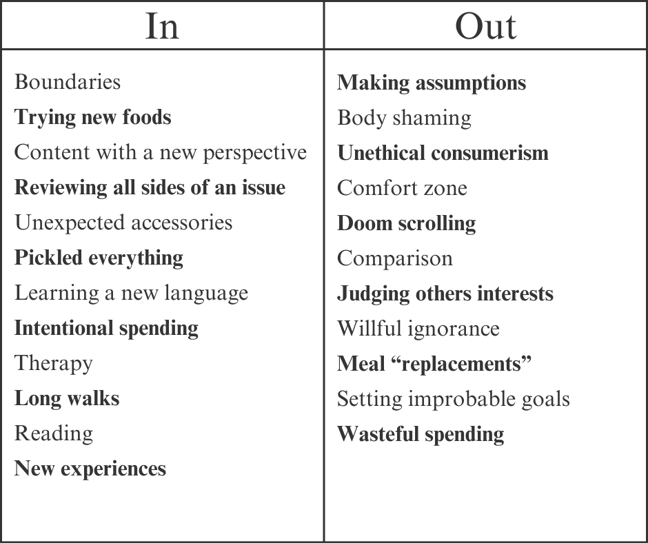 As cheesy as some may find the whimsy of January 1st, I love it. I love the mentality of new beginnings and endless possibilities. As I was deciding what I wanted this blog post to be about, I landed on an in/out list; yes, because they’re trendy right now but also because I love the comprehensiveness, the decisiveness of what you stand for and against, and the ease of which you can look back and see what’s changed for you over the year. Also, these lists remind me of the Clique series, which I was very fond of as a kid.